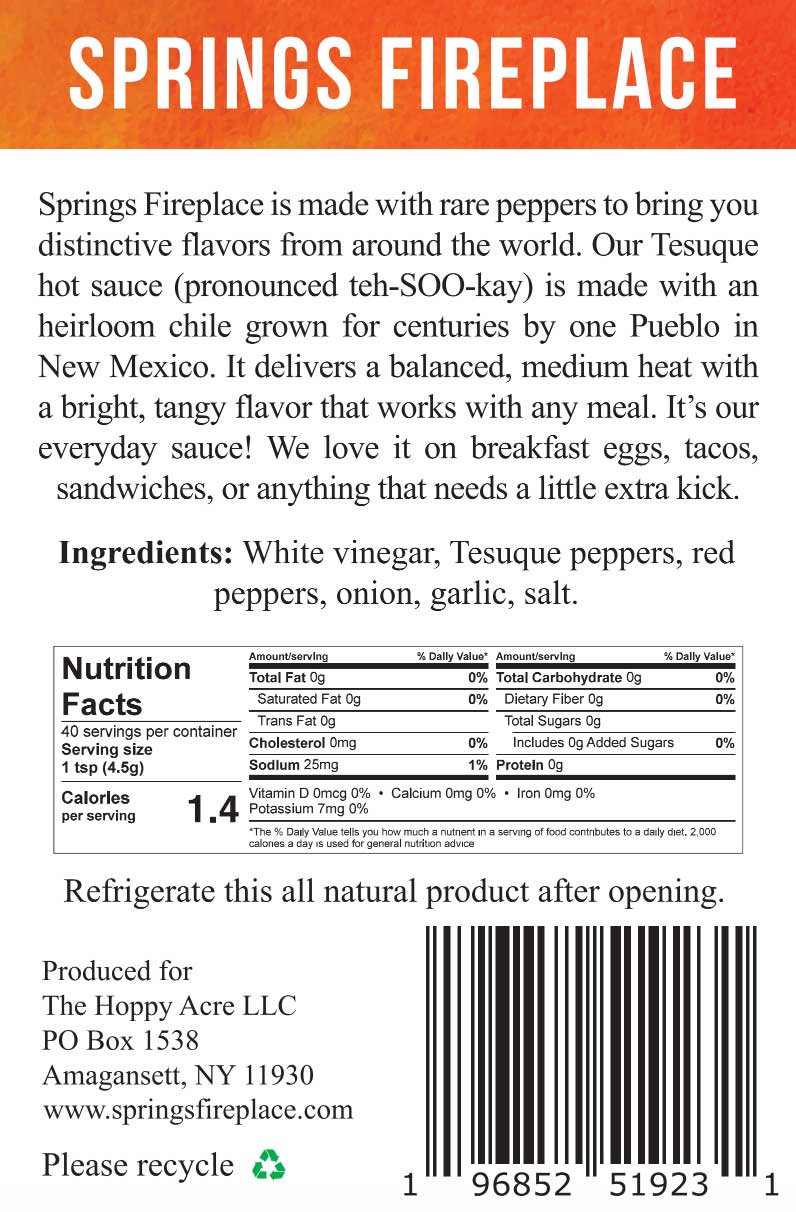 Tesuque Hot Sauce: A 2025 Scovie Award winner with bright, tangy flavor and medium heat from heritage Tesuque chiles first cultivated 300 years ago by the Tesuque Pueblo. Our everyday sauce, it goes with everything from eggs and tacos to pizza and even a Bloody Mary.
